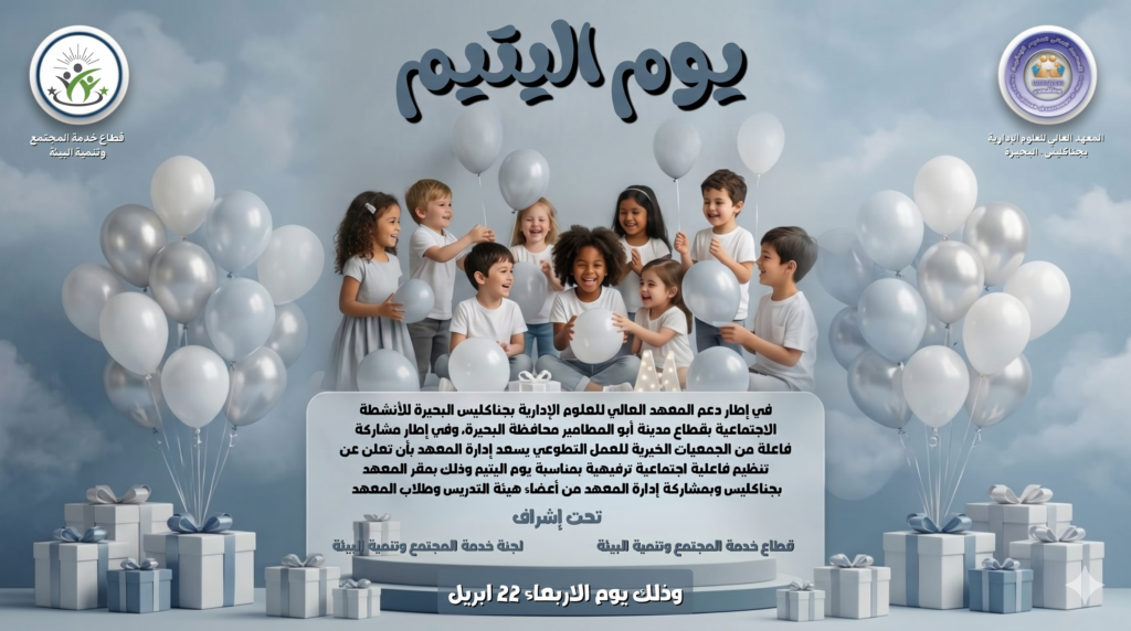 في إطار حرص المعهد العالي للعلوم الإدارية بجناكليس على تفعيل دوره المجتمعي الرائد، وانطلاقاً من إيمانه العميق بأهمية التكافل الاجتماعي، يعلن المعهد عن تنظيم احتفالية كبرى بمناسبة “يوم اليتيم”، وذلك يوم الأربعاء الموافق 22 أبريل.